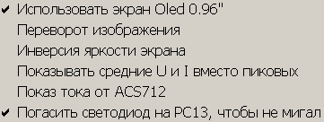 Можно отключить вывод на экран, например, если он физически не подключен, чтобы не тратить время. Также можно менять ориентацию экрана и включать инверсию яркости. Можно настроить, какие измерения тока и напряжения должны отображаться на экране: пиковые или средние. Также можно отключить мигание светодиода на плате с МК.