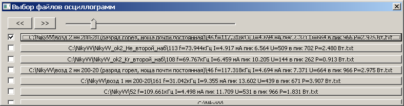 Кнопки "<<" и ">>" и слайдер рядом позволяют отображать файлы, полученные в режиме записи анимации. При их использовании в каталогах осуществляется поиск файла, имя которого начинается на заданное число, и если такой файл существует, он будет открыт для отображения. Это позволяет сравнивать между собой записи в разных каталогах (например, результаты съёмки для различных исследуемых газов положены в разные каталоги, а выбираются файлы с одинаковым номером, например, полученные с одинаковой частотой).