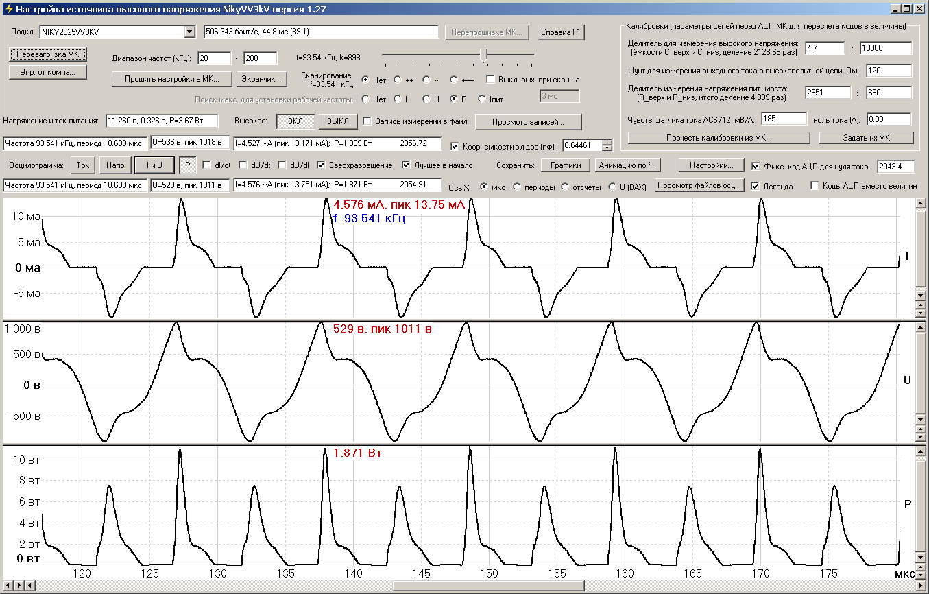 Программа NikyVV3kV предназначения для настройки и управления источником высокого напряжения по usb, для отображения измерений токов, напряжений и мощности (в том числе осциллограмм со сверхразрешением), для записи выполненных измерений в текстовые и графические форматы и их визуализации. Также возможно управление по Web Usb.